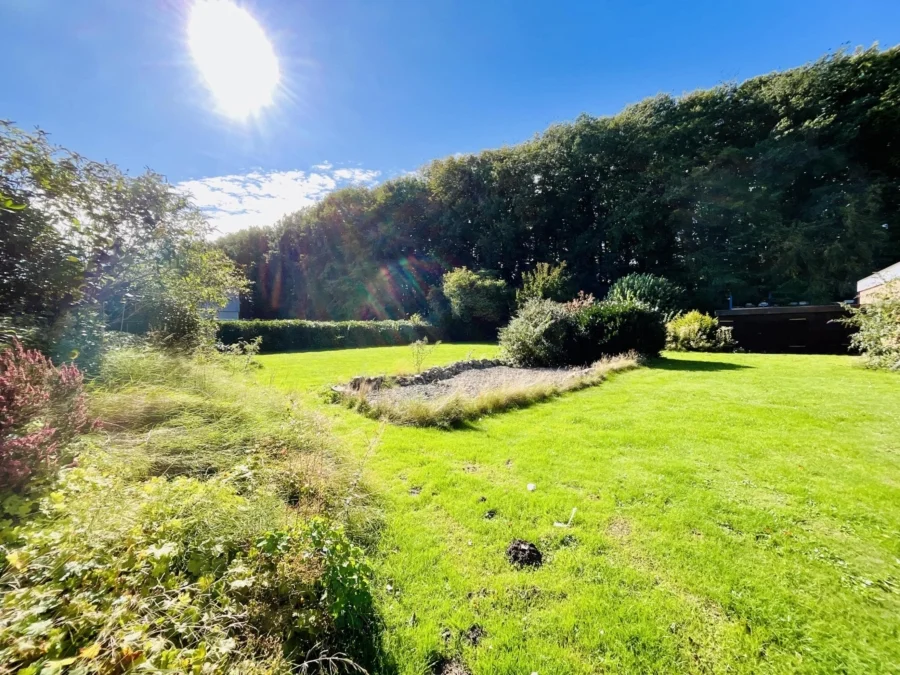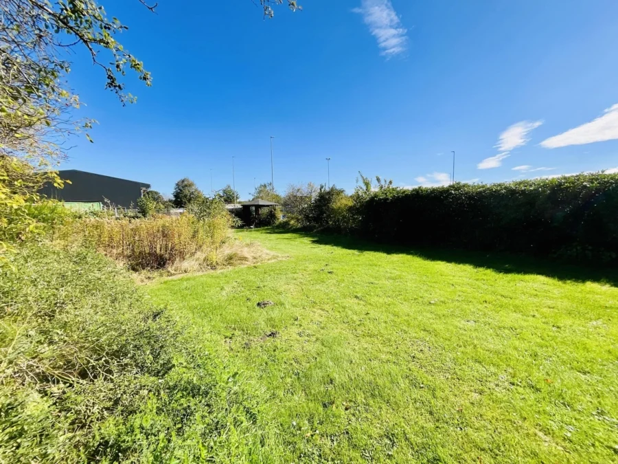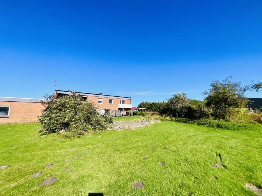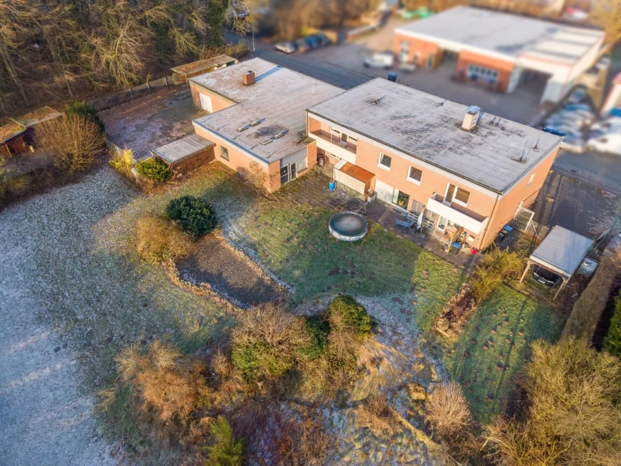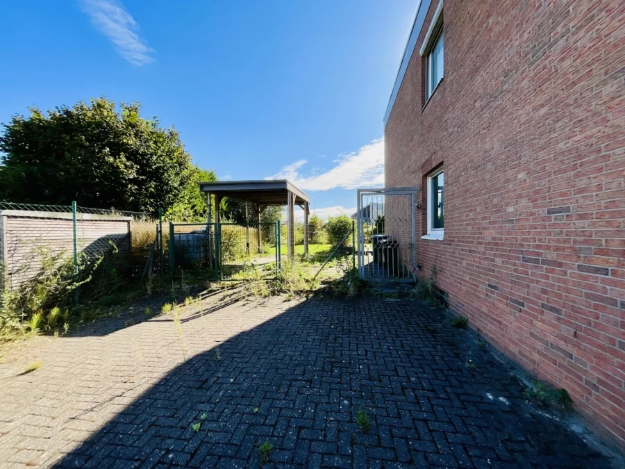 Im Außenbereich des Gartens befindet sich noch ein Wohnmobilcarport und eine Lagerhalle (ca. 70 m²), wo in der Vergangenheit ein Schwimmbad war, welches jedoch mit Sand verfüllt wurde. Zuletzt wurde die Halle als Lager und Werkstatt genutzt. Das Grundstück ist mit einer Zaunanlage eingefriedet. Der ehemalige Gartenteich wurde verfüllt und der große Garten wurde pflegeleicht mit Rasenflächen und wenigen Pflanzbereichen angelegt. Im hinteren Gartenteil befinden sich noch Holz- und Geräteschuppen sowie ehemalige Pferdeställe.