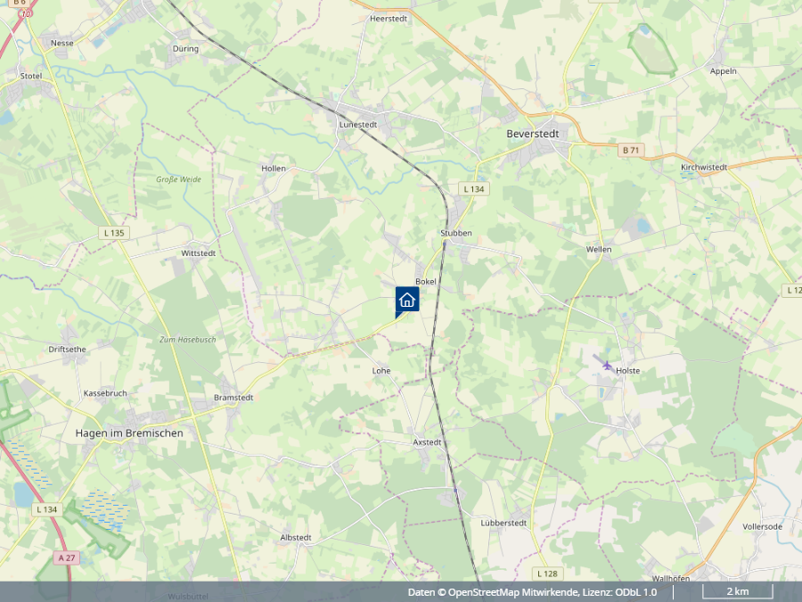 Bokel liegt im Landkreis Cuxhaven im Land Niedersachsen und gehört zur Gemeinde Beverstedt. Es liegt ungefähr in der Mitte zwischen Bremen und Bremerhaven in ländlicher Umgebung und ist durch eine eher ruhige, naturbelassene Landschaft geprägt, die typisch für das niedersächsische Umland ist und eine Vielzahl an Möglichkeiten für Naturliebhaber, Wanderer und Radfahrer bietet oder auch Ausflüge zum nahegelegenen Nationalpark Niedersächsisches Wattenmeer ermöglicht. In der näheren Umgebung zum Baugebiet befinden sich eine Kindertagesstätte, die ortseigene Grundschule und der Sportplatz. Die L 134 verbindet Bokel mit Hagen und Beverstedt, wo fast alle Versorgungseinrichtungen sowie Rathaus, Gewerbe-, Handwerks- und Dienstleistungsbetriebe vorhanden sind. Die B 71 führt von der A 27 (Bremerhaven) nach Bremervörde, Stade und Hamburg. Die nächsten Bahnstationen nach Bremen und Bremerhaven erreichen Sie im 5 Autominuten entfernten Stubben oder Lunestedt.