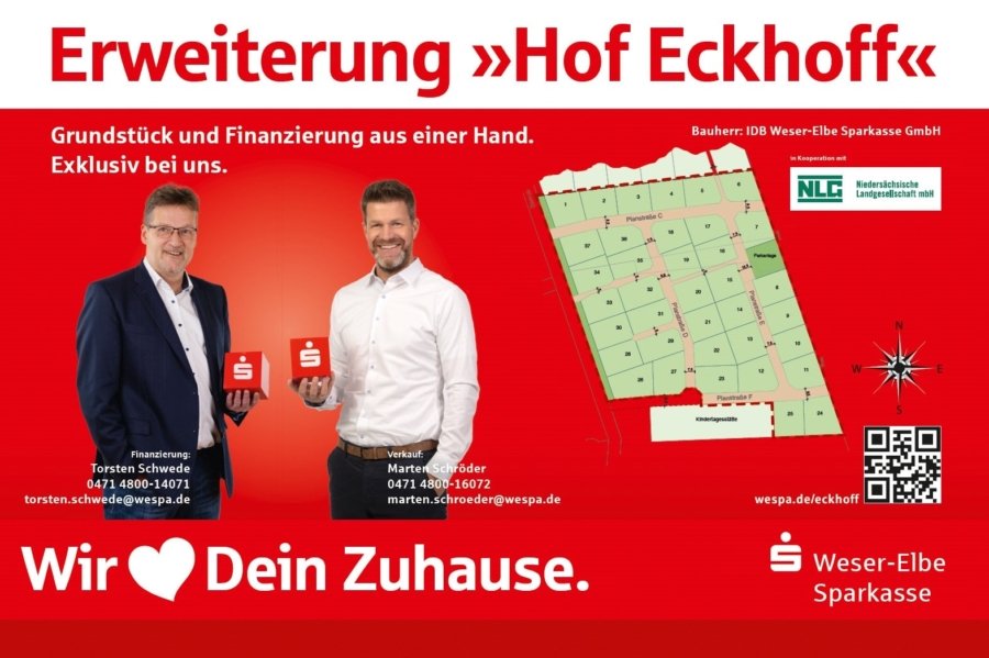 Das neue Baugebiet „Erweiterung Hof Eckhoff“ in Bederkesa: Hier warten zahlreiche Grundstücke auf Sie und Ihr Bauvorhaben. In ruhiger Wohnlage bieten die Grundstücke verschiedener Größe ausreichend Platz sowohl für Einfamilienhäuser als auch für Doppelhäuser. Die zulässige Bebauung richtet sich für dieses Wohngebiet nach dem vorliegenden Bebauungsplan Nr. 40 der Stadt Geestland. Die Grundstückskaufpreise beinhalten die öffentlichen Erschließungs- (Straßenbaukosten) und Kanalbaukosten (SW-/RW-Systeme) sowie Grundstücksanschlussleitungen mit Übergabeschächten für Schmutz- und Regenwasser. Die Beiträge und Kosten für die individuellen Hausanschlüsse, wie zum Beispiel Strom, Wasser oder Telekommunikation, sowie eine eventuelle Abmarkung des Grundstücks mit Grenzsteinen sind selbst zu tragen. Die Baufirma hat die Erschließungsmaßnahmen abgeschlossen, sodass die Baureife gegeben ist. Verwirklichen Sie innerhalb einer dreijährigen Bauverpflichtung Ihren Traum vom Eigenheim.