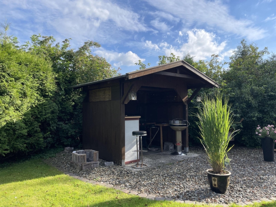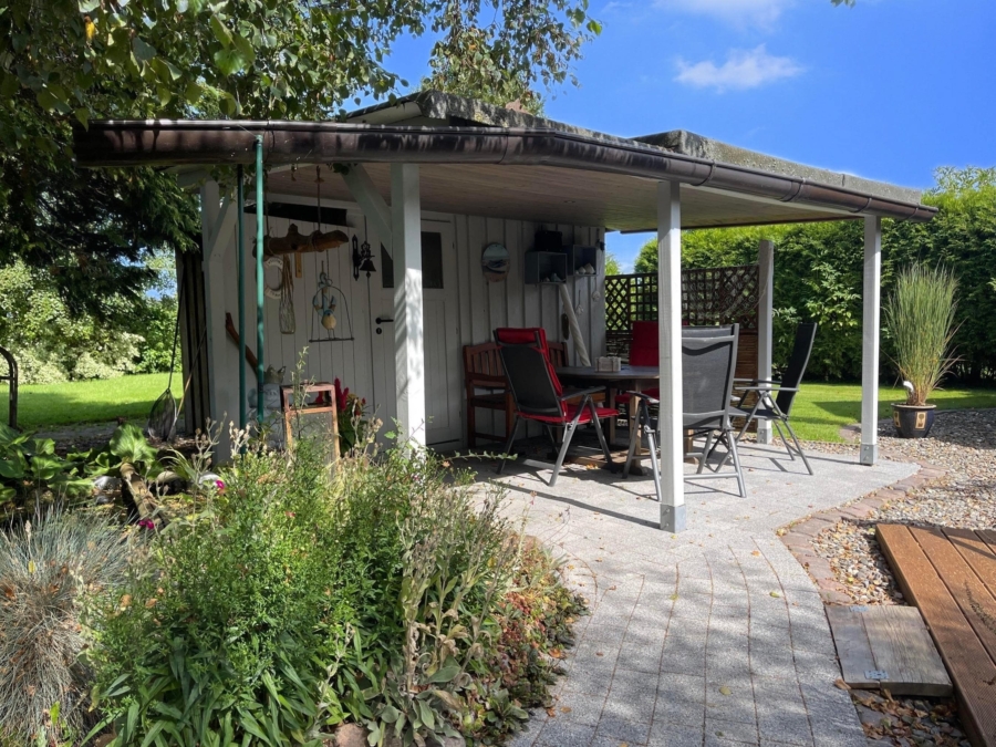 mit Carport, mehreren Terrassen, überdachtem Freisitz, Gartenteich, Grillhaus und 2 Gartenhäusern