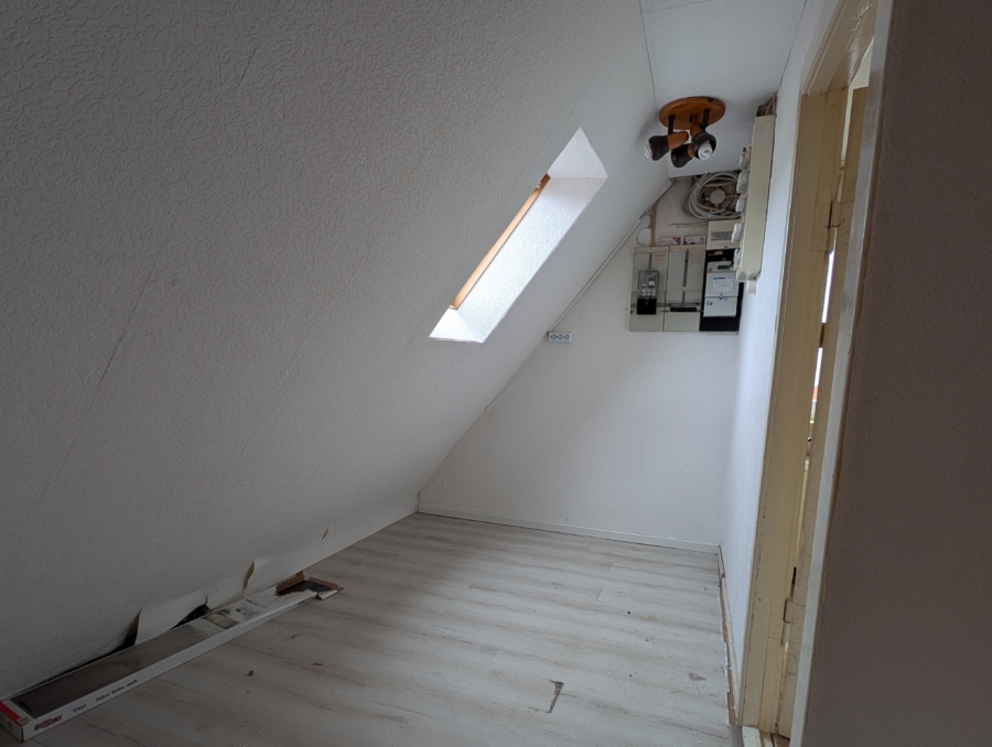 Der vordere Treppenaufgang zum Obergeschoss wurde durch eine Trockenbauwand verschlossen, lässt sich jedoch problemlos wiederherstellen, um den ursprünglichen Eingang wieder zu öffnen. Alternativ befindet sich im hinteren Bereich des Hauses ein weiterer Zugang, der ebenfalls ins Obergeschoss führt.