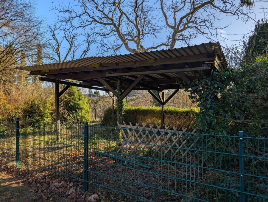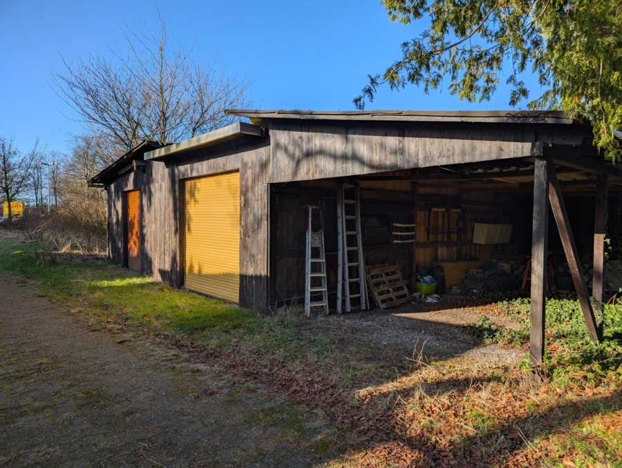 Auf dem ca. 2.763 m² großen Grundstück befinden sich mehrere Nebengebäude, darunter ein kleines Nebengebäude, ein baufälliges Doppelcarport sowie ein Schuppen mit angrenzendem Carport. Der Garten ist inzwischen stark verwildert und erfordert umfangreiche Rückschnitt- und Pflegearbeiten – bietet aber durch seine Größe viel Potenzial für Neuplanung oder Neuanlage.