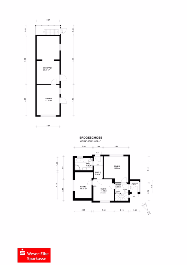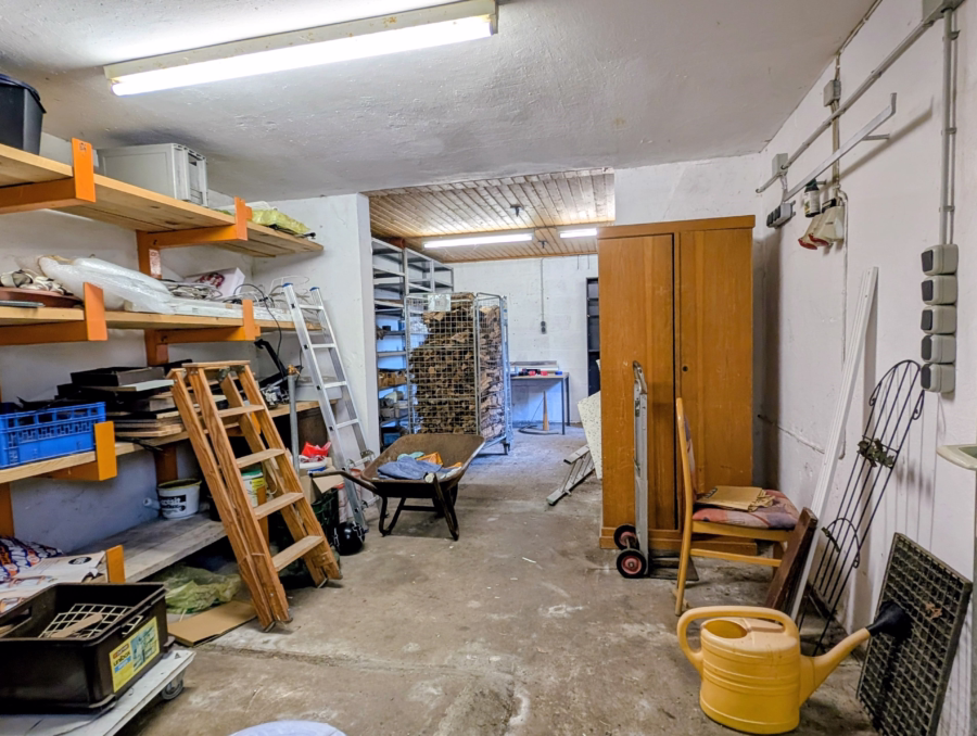 Das massive Nebengebäude erweitert die Nutzungsmöglichkeiten erheblich: Neben der integrierten Garage mit elektrischem Tor stehen zwei zusätzliche Räume zur Verfügung, die sich ideal als Hobbyraum, Stauraum oder beispielsweise als Platz für Fahrräder, Kinderfahrzeuge oder eine kleine Werkstatt eignen. Im Untergeschoss befindet sich zudem ein separater Kellerraum als weitere Lagerfläche.