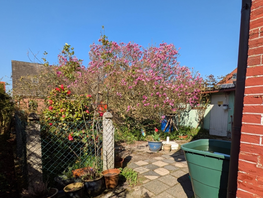 Der Hauptteil des Grundstücks liegt idyllisch hinter dem Deich und verfügt über einen direkten Zugang zur Oste – ein echtes Highlight für Naturliebhaber, Paddler oder alle, die gern am Wasser wohnen. Direkt am Haus selbst befinden sich eine kleine Terrasse und ein Gartenhaus.