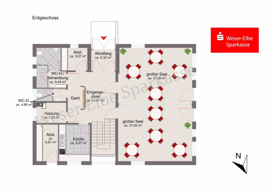 Die Immobilie bietet vielfältige Nutzungsmöglichkeiten – ideal für kirchliche, soziale oder kulturelle Einrichtungen sowie für Seminar- und Veranstaltungszwecke. Bereits beim Betreten des Hauses empfängt Sie ein großzügig gestalteter Eingangsbereich, der ausreichend Platz für Besucherströme und einen einladenden Empfang bietet. Das Herzstück der Immobilie bildet der große Saal, der dank einer flexiblen Trennwand bei Bedarf in zwei separate Bereiche unterteilt werden kann. Diese Flexibilität ermöglicht eine parallele Nutzung für unterschiedliche Veranstaltungen oder Gruppen. Im Erdgeschoss stehen zudem eine funktionale Küche, ein Heizungsraum sowie ein praktischer Abstellraum zur Verfügung. Für Besucher und Nutzer sind getrennte Damen- und Herren-WCs vorhanden. Das Dachgeschoss erweitert das Raumangebot erheblich: Hier befinden sich ein großes Büro, das sich ideal für Verwaltungs- oder Organisationsaufgaben eignet, sowie ein großzügiger Bewegungsraum, der vielfältig genutzt werden kann – beispielsweise für Kurse, Gruppenaktivitäten oder Freizeitangebote. Ergänzt wird diese Ebene durch eine Diele sowie ebenfalls getrennte Damen- und Herren-WCs. Das weitläufige Grundstück bietet nicht nur ein angenehmes Umfeld, sondern auch Potenzial für Außenaktivitäten oder Erweiterungen. Vier vorhandene Stellplätze sorgen für eine komfortable Parksituation direkt am Objekt.