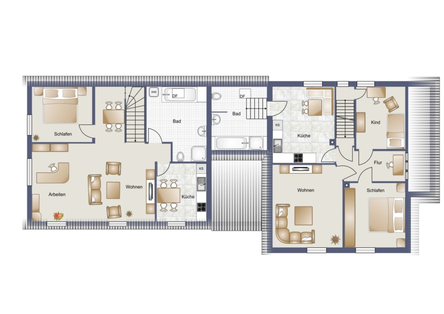 Die Wohnungen verfügen über 3, 2, 3 sowie 4 Zimmer (Maisonette-Wohnung über 2 Ebenen) und haben alle separate Eingänge.