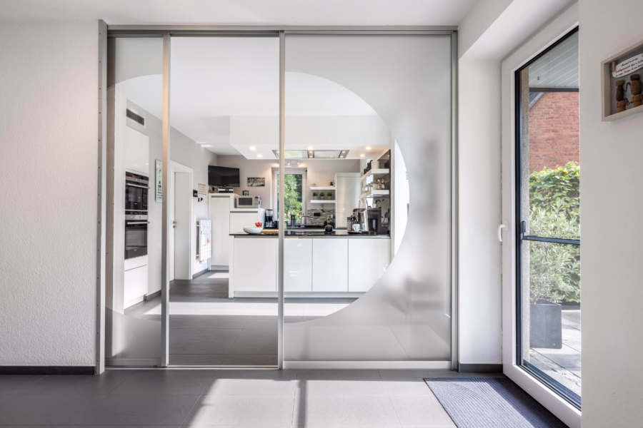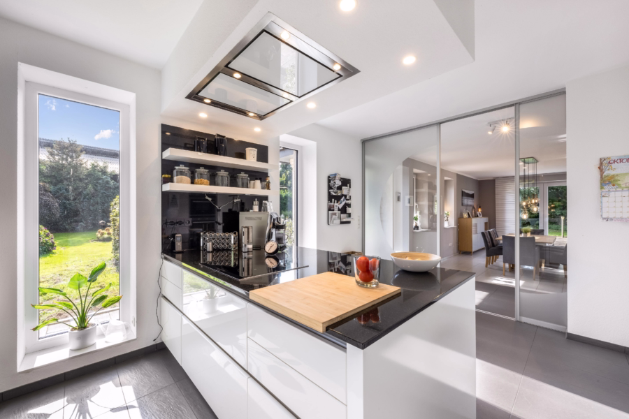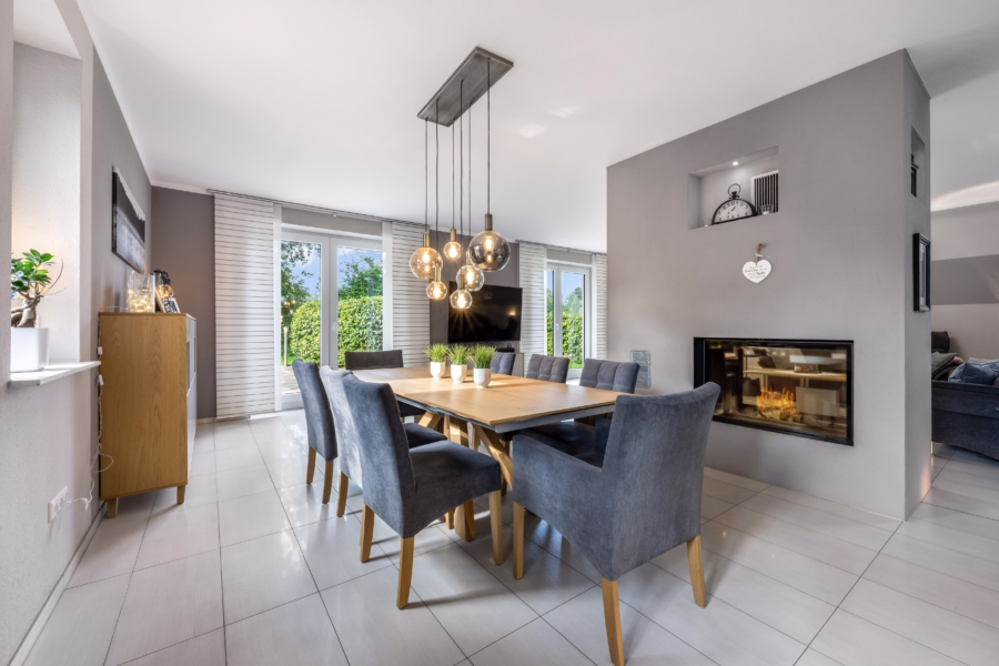 Herzstück des Hauses ist das großzügige Wohn- und Esszimmer mit zentral stehendem Design-Kaminofen, das mit beeindruckender Weite, Licht und Gemütlichkeit begeistert. Die offene Küche wurde mit einer modernen Schiebetür ausgestattet, um bei Bedarf Gerüche elegant zu separieren – funktional und stilvoll zugleich.