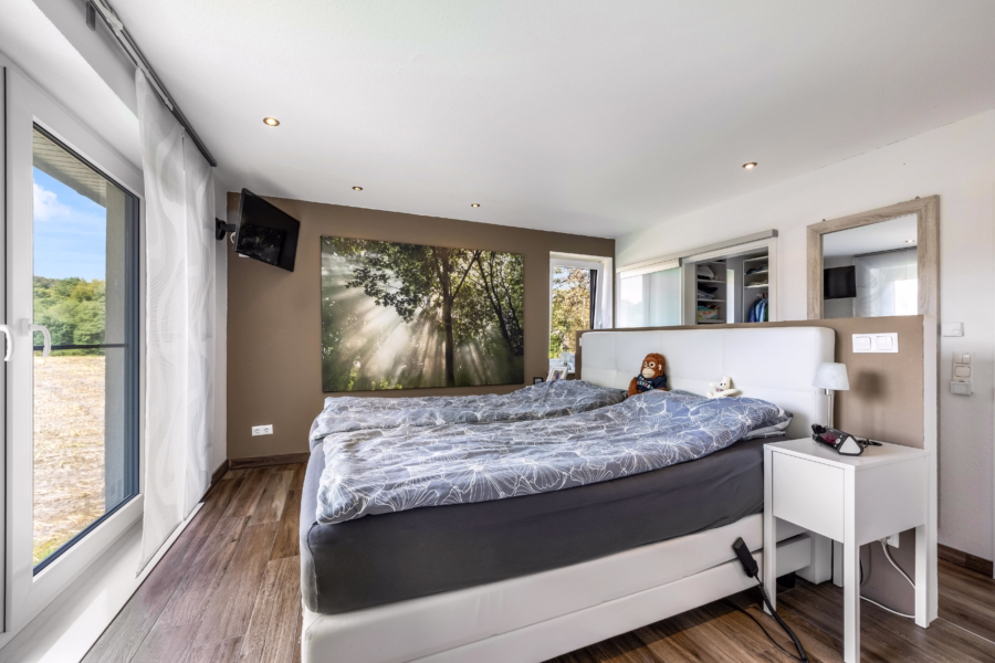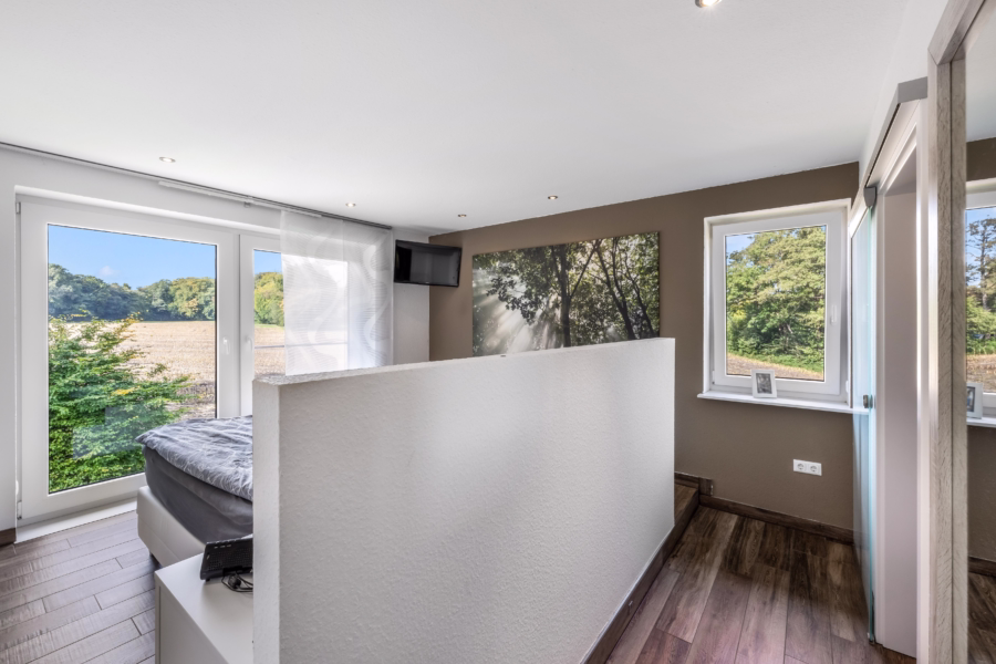 Hier erwarten Sie: ein Kinderzimmer, ein Badezimmer, ein Büro – das sich ideal als Homeoffice eignet, ein weiterer Abstellraum sowie der durchdacht gestaltete Elternbereich: Ein Schlafzimmer mit angrenzender Ankleide und einem exklusiven En-Suite-Bad, das ausschließlich über das Schlafzimmer erreichbar ist – Privatsphäre auf höchstem Niveau.