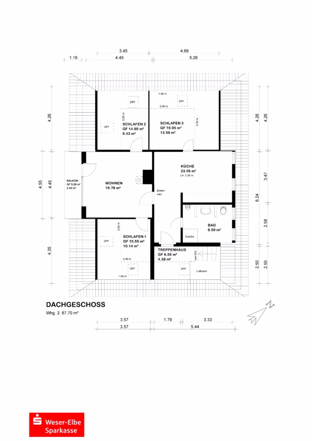 Über eine Massive Treppe gelangen Sie in die obere ca. 87,7 m² große Dachgeschosswohnung, welche über 3 Schlafzimmer, eine geräumige Essküche sowie ein Wohnzimmer mit Kaminofen und Ausgang zum Balkon verfügt. Das moderne Duschbad im Obergeschoss bietet zusätzlich den Platz und die Möglichkeit eine Badewanne sowie eine Waschmaschine einbauen zu lassen. Die Dachgeschosswohnung wird derzeit als Ferienwohnung genutzt und bietet damit weitere Nutzungsmöglichkeiten.