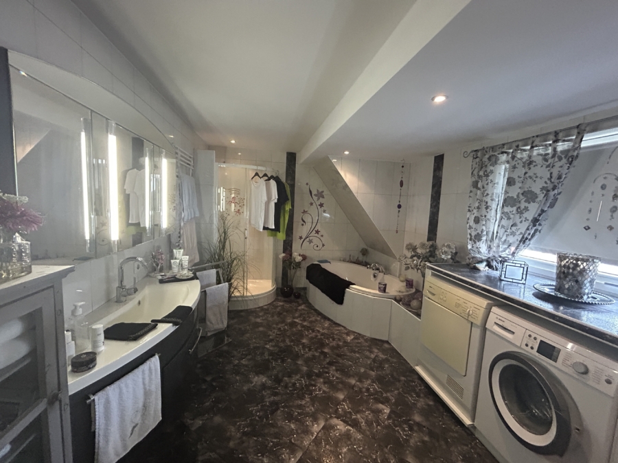 Das zweite Haus liegt im hinteren Bereich des Grundstückes. Ein Teil des Erdgeschosses sind eine Garage (beispielsweise für ein Wohnmobil) sowie ein Büro mit zwei Arbeitsplätzen. Der vordere Teil ist aktuell eine Werkstatt und Lager für den Malerhandwerksbetrieb der Eigentümer. Das ausgebaute Dachgeschoss bietet Ihnen ca. 100 m² Wohnfläche zzgl. ausgebautem Spitzboden und Dachterrasse.