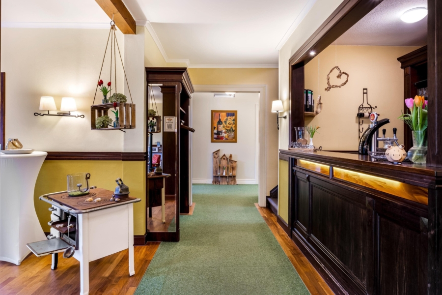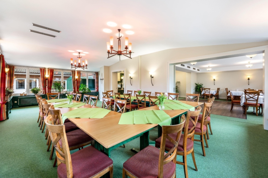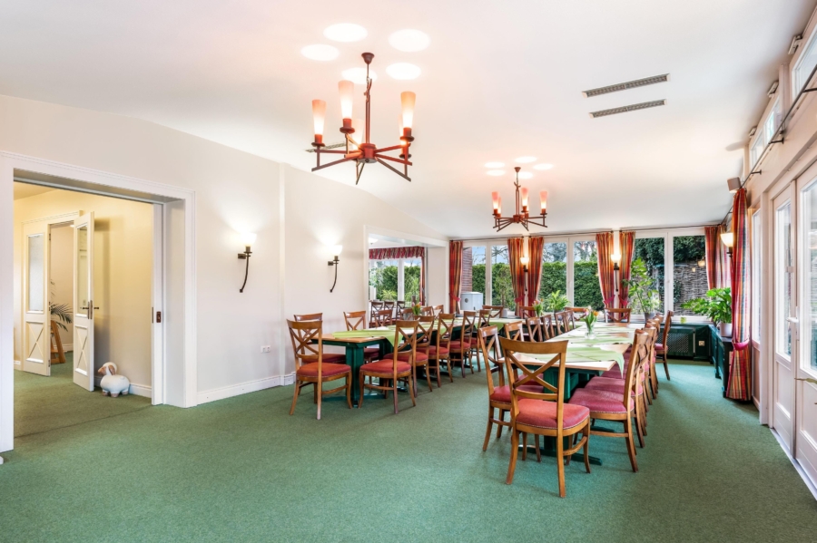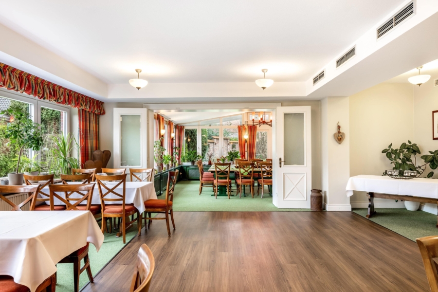 Flexibler Grundriss für Pflege- und Gemeinschaftsräume: 280 m² großer Veranstaltungsraum plus mehrere stilvoll gestaltete, helle Räumlichkeiten (Landhausstube, Alte Gaststube, Wintergarten) – flexibel nutzbar für Gruppenaktivitäten, Events oder Betreuungsangebote