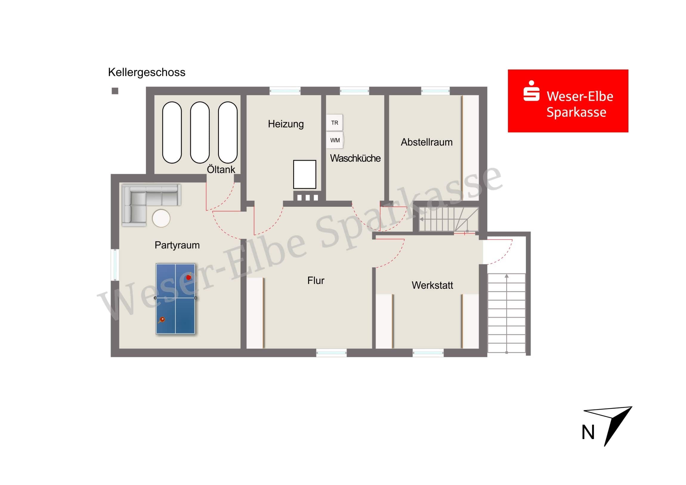 Der Keller erstreckt sich über die gesamte Grundfläche und bietet neben der Heizungs- und Waschküche viel Raum für Lagerung, Hobby oder Werkstatt.